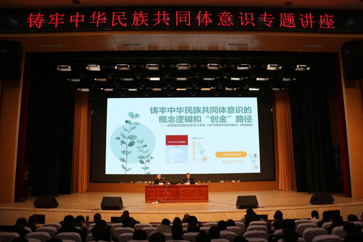 为深入学习贯彻习近平总书记关于民族工作的重要论述,增强师生对中华民族共同体的认同感与凝聚力,11月10日,学校党委统战部、天山英才教育教学名师工作室联合邀请广西民族大学民族学研究员、全国民族团结进步模范个人龚永辉,在产教融合楼大礼堂开展铸牢中华民族共同体意识专题讲座。校党委常委、统战部部长曹兴举出席并讲话,全校教职工及学生代表共同参加学习。