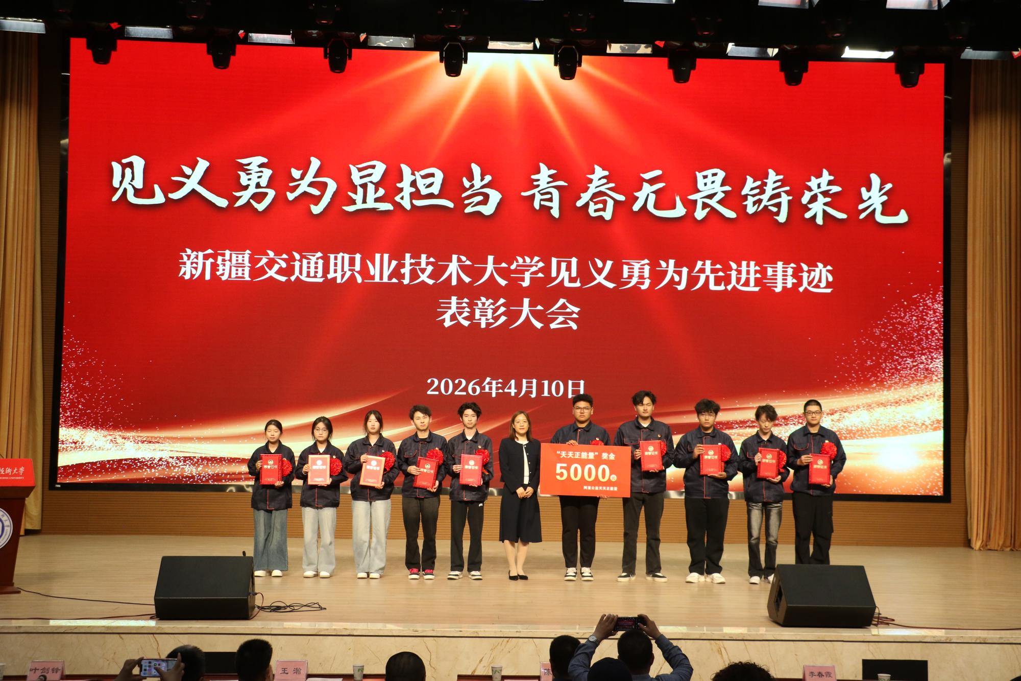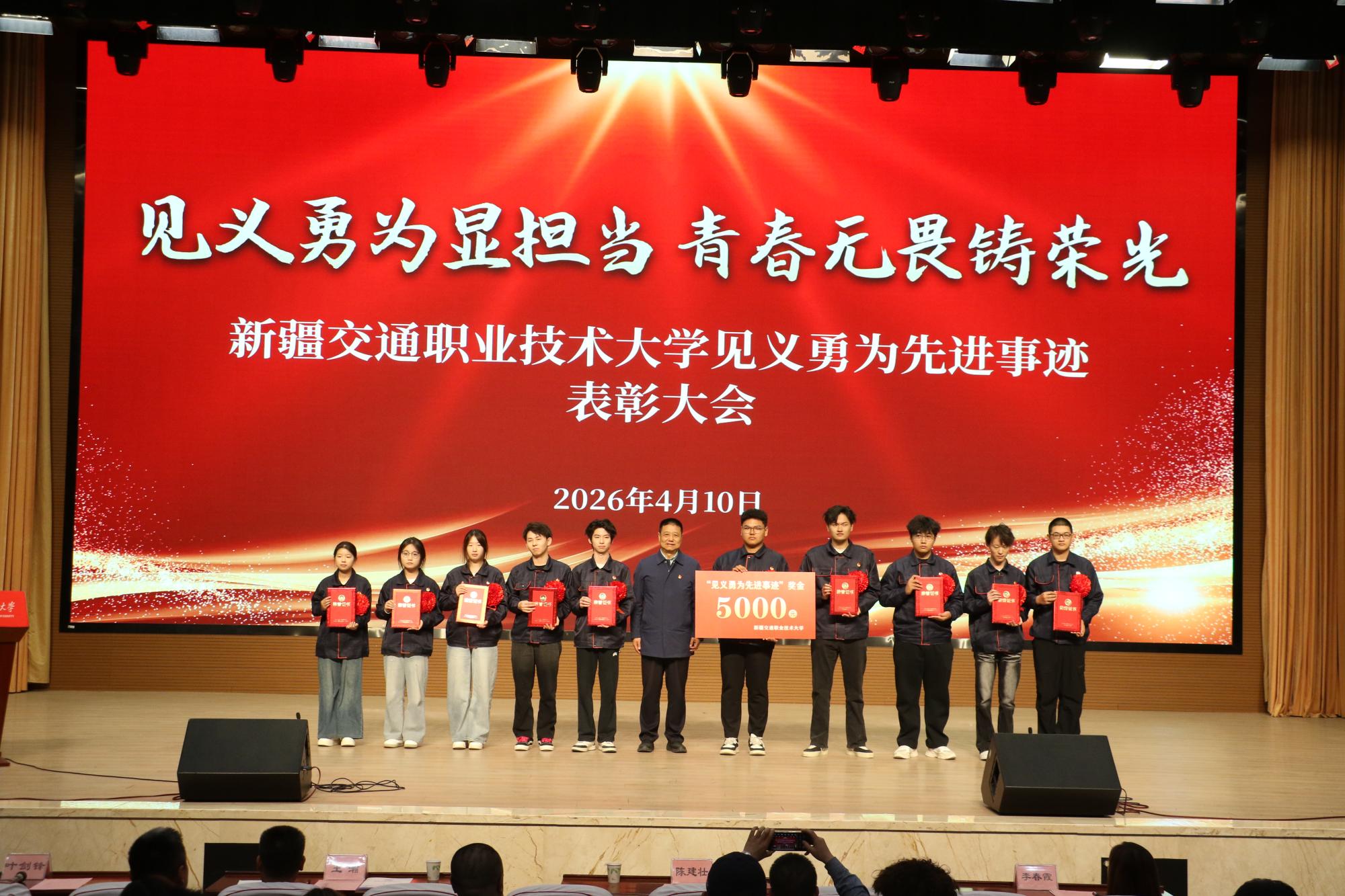 4月10日下午,学校在产教融合楼大礼堂举行见义勇为先进事迹表彰大会,对何乐等10名在危急时刻挺身而出、勇敢救火的学生予以表彰。校党委副书记、校长陈建壮,校党委副书记王瀚,新疆日报社会新闻部主任李春霞等出席大会。